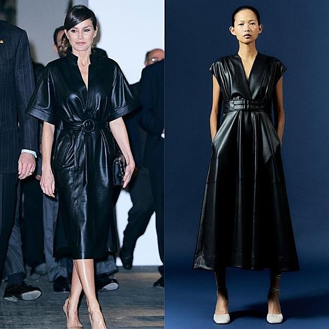 Comme deuxième proposition, la robe en cuir désormais emblématique que nous avons vue tant de fois et qui est devenue particulièrement célèbre après son apparition dans ARCO ne pouvait pas manquer. Ce modèle est l’un des favoris de Doña Letizia et, actuellement, une version très similaire se trouve dans les ventes Esfera.
