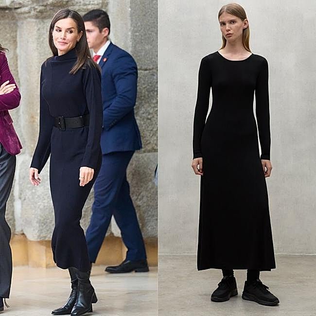 En pensant déjà aux mois les plus froids et aux looks de janvier et février, nous ne pouvons pas oublier la robe en tricot noir que la reine a associée à une ceinture et des bottes hautes. Un basique parfait pour le quotidien que vous pourrez reproduire avec ce modèle que nous avons déniché chez Ecoalf.